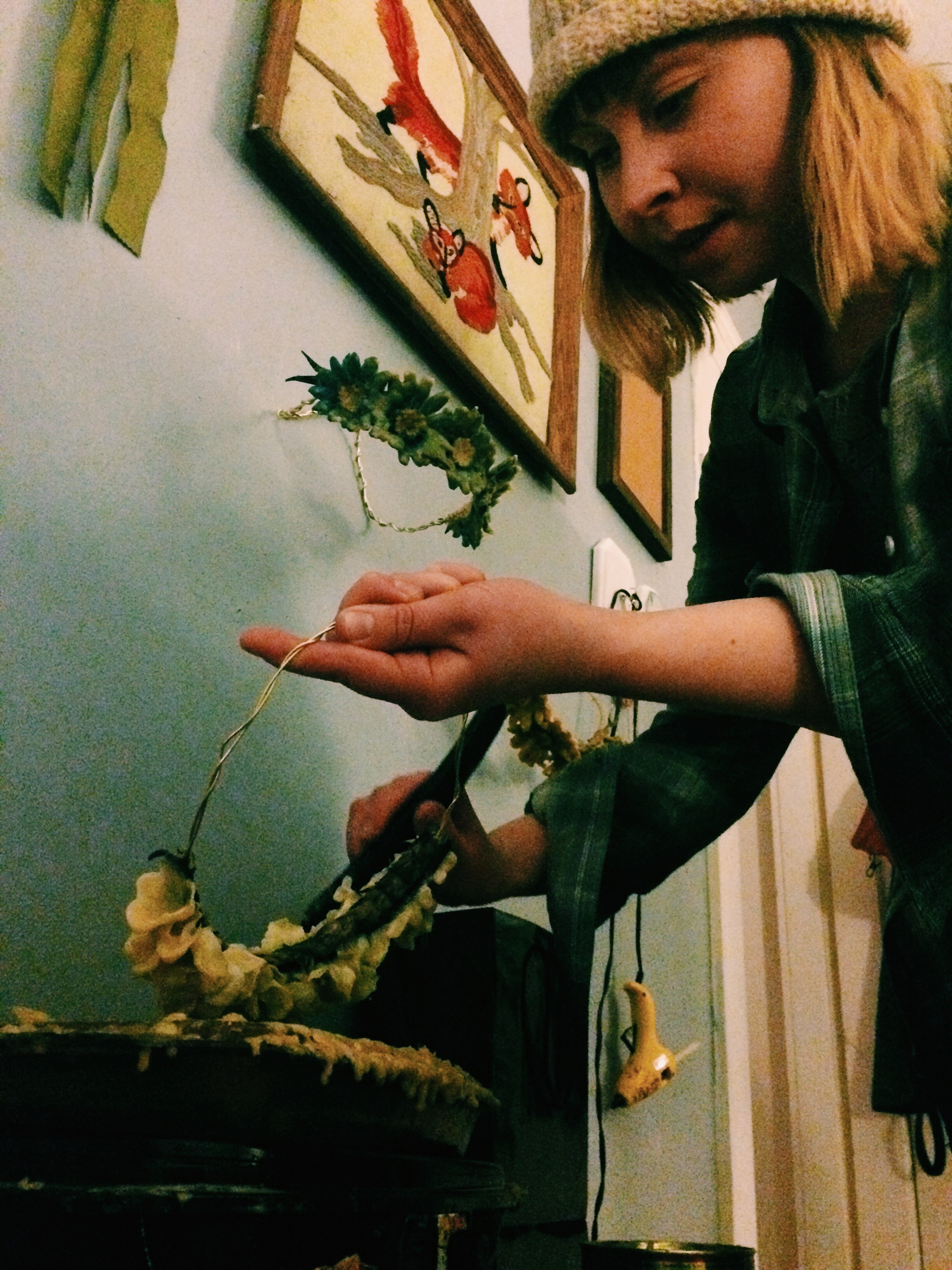 Shaw graduated from Mass Art in 2012. Since then, she’s been splitting her time between curating her own drawing, painting, sculpting and knitting and her “day job” in co-running the Harvard Square specialty shop Follow the Honey. Follow the Honey focuses on locally made and produced products, services and lessons focused on bees and their honey. Along with her managerial role, Shaw is also a featured artist at the store. Recently, this has materialized in the design and creation of hand-sewn flower crowns dipped in bees wax.