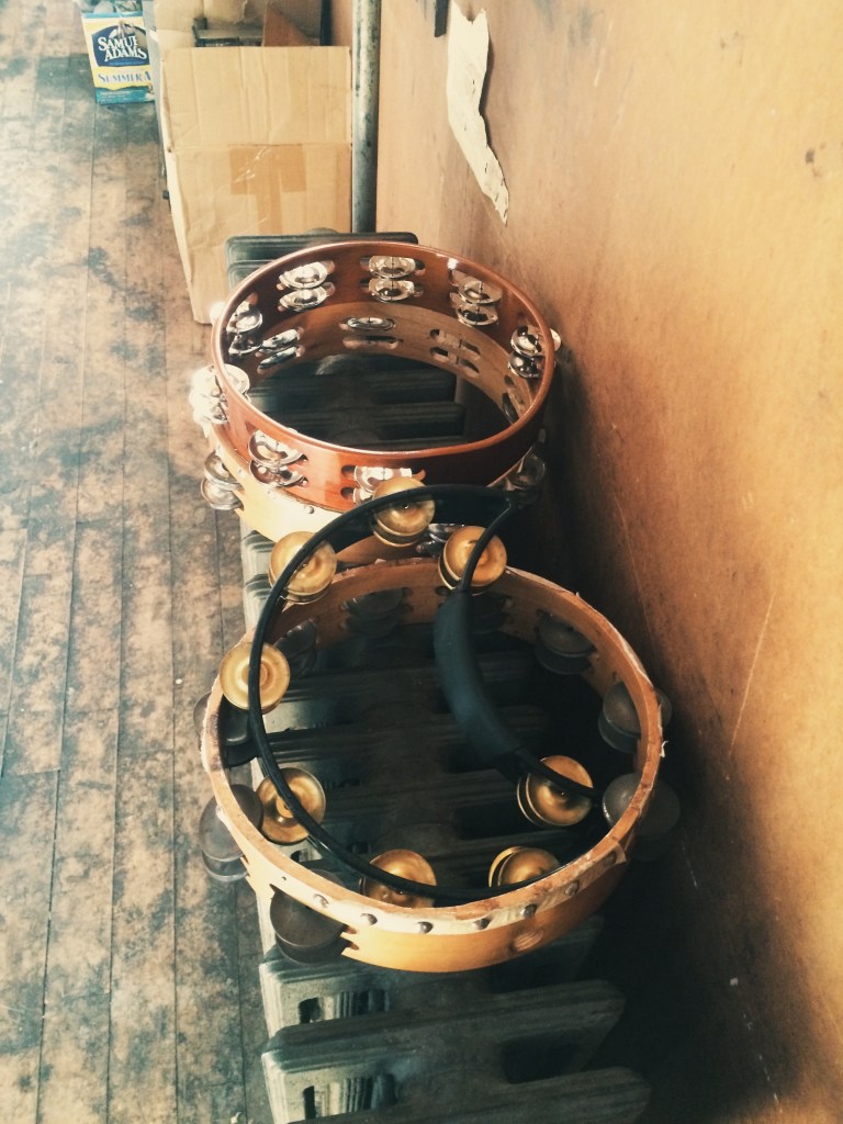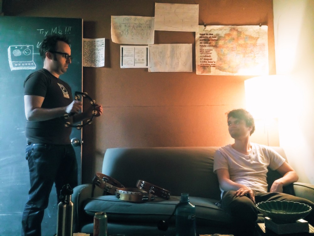Elio and Tyler completing a “percussion test” to see which tambourine to use.