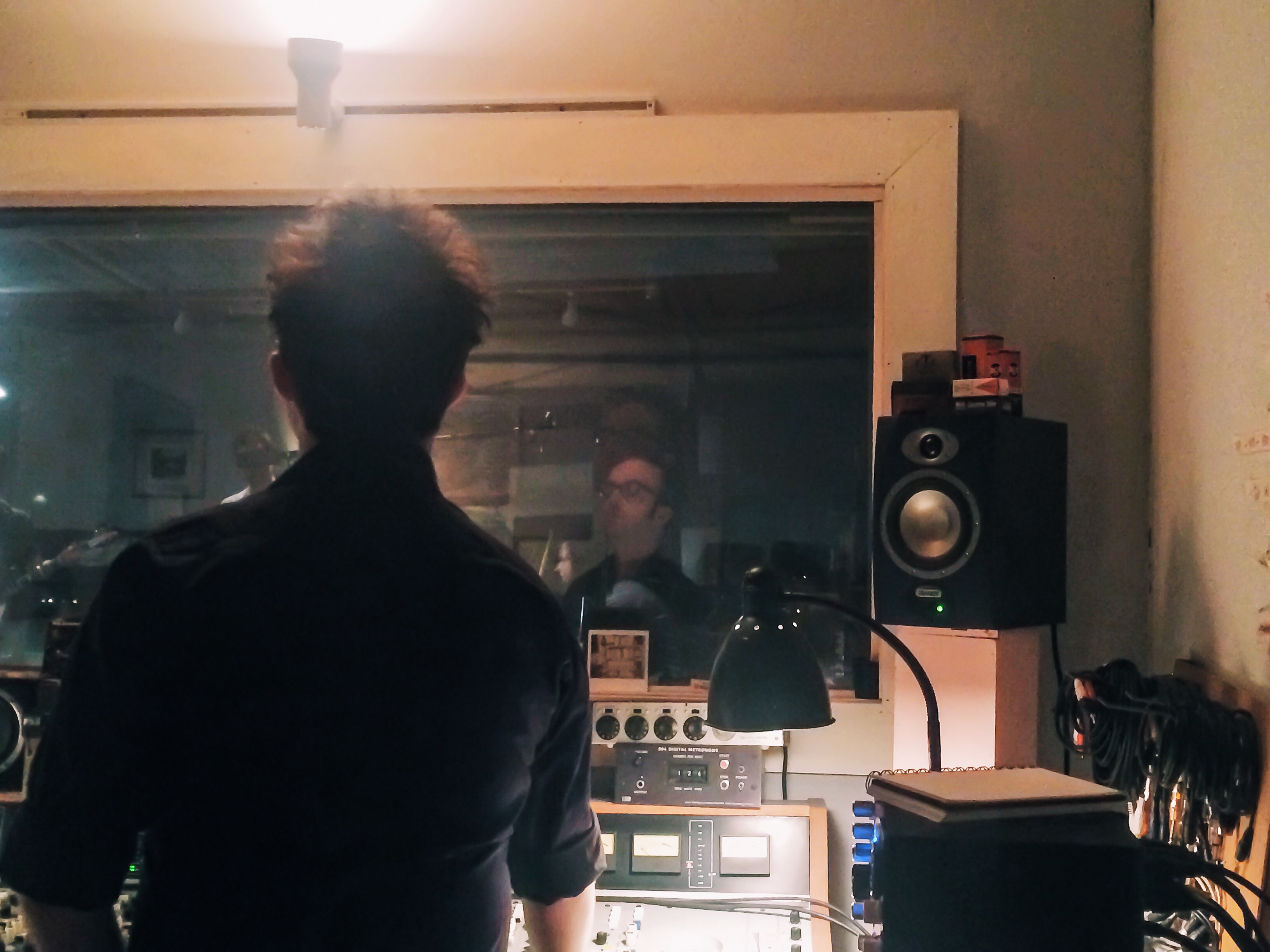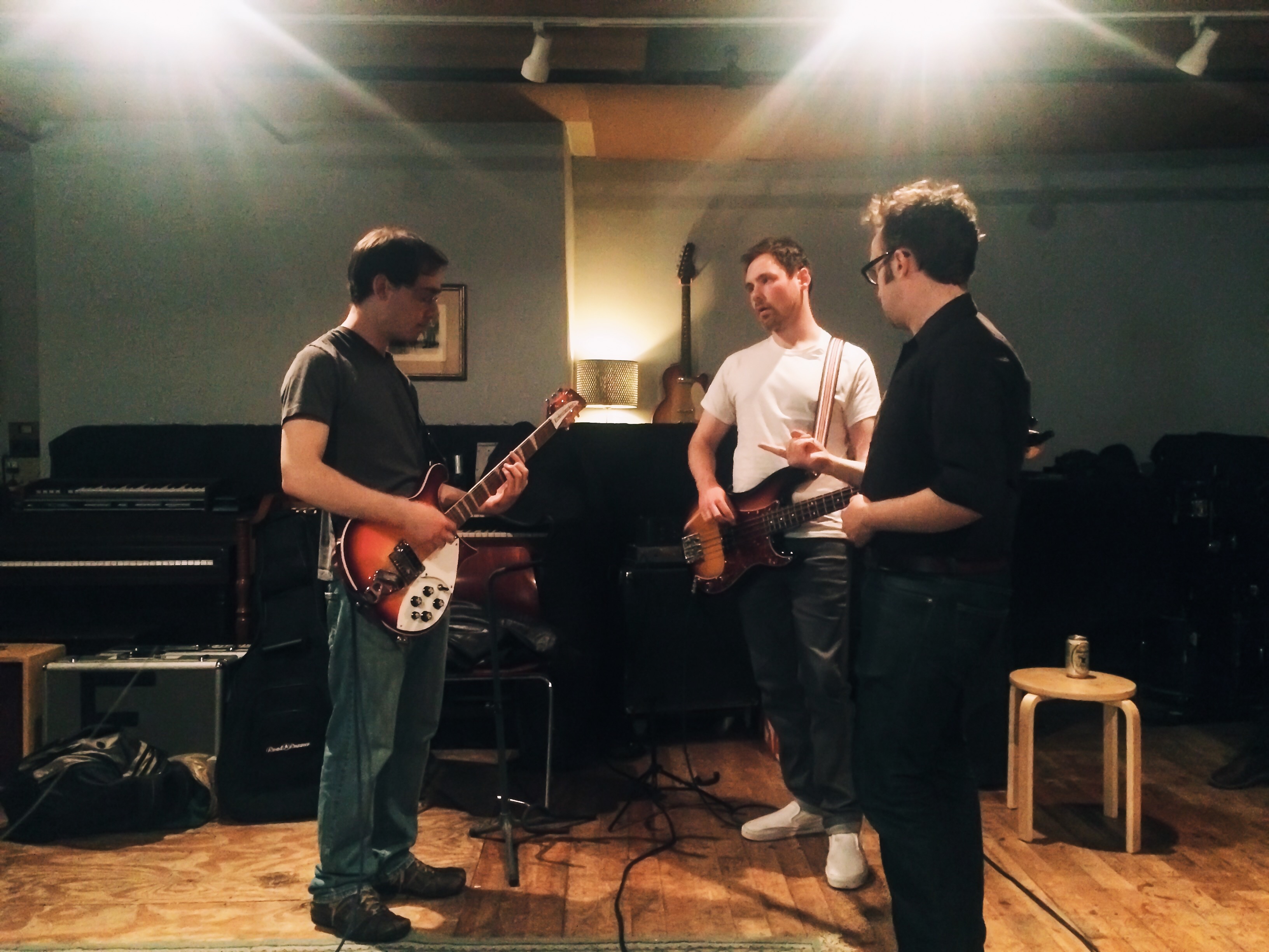 Elio talking with the band on Sunday before starting guitar overdubs.