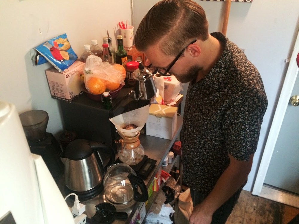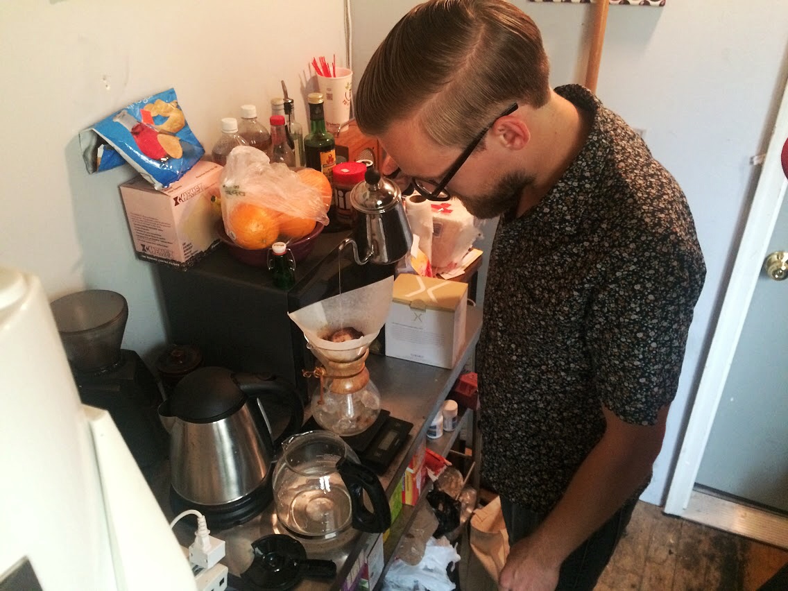 Each morning, drummer Matt Freake provided pour over coffee for everyone in the studio. However, sound and photos of the pour over process were only taken on Saturday morning.